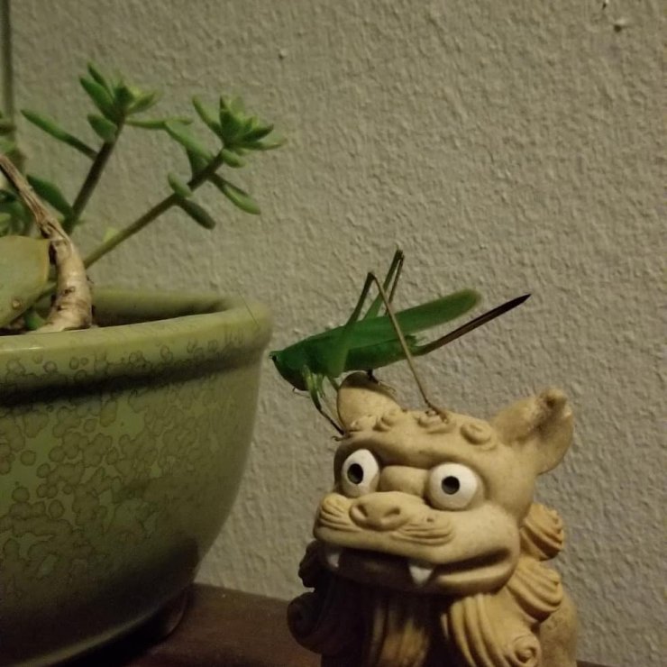 ヒトデヨガスペースから見えた月とシーサーに乗ったバッタ~😆(笑)